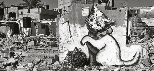 A photograph showing a cat is everywhere on the media. The cat is painted on what is left of a wall in…