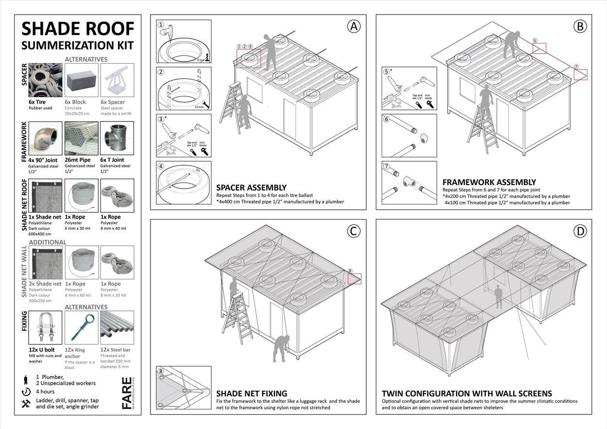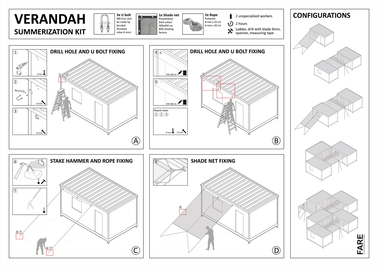 As for the the canopy, the veranda was designed in order to be realized by every family refugee in the easiest way possible; for this reason FAREstudio has realized a manual also for this part of the project.