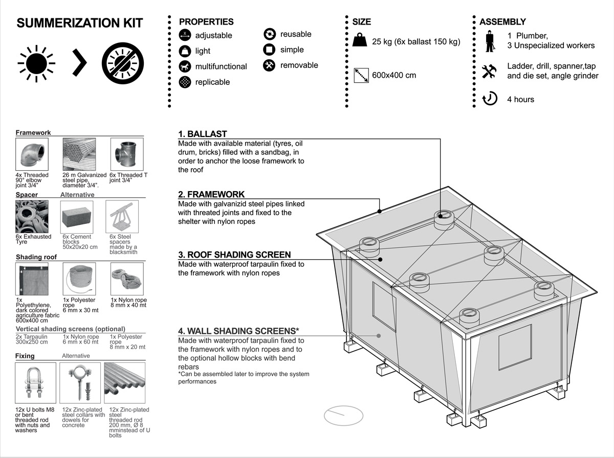 Description: A do-it-yourself upper canopy + veranda assembly kit to mitigate shelter internal temperature and offer an external protected space to refugee families.